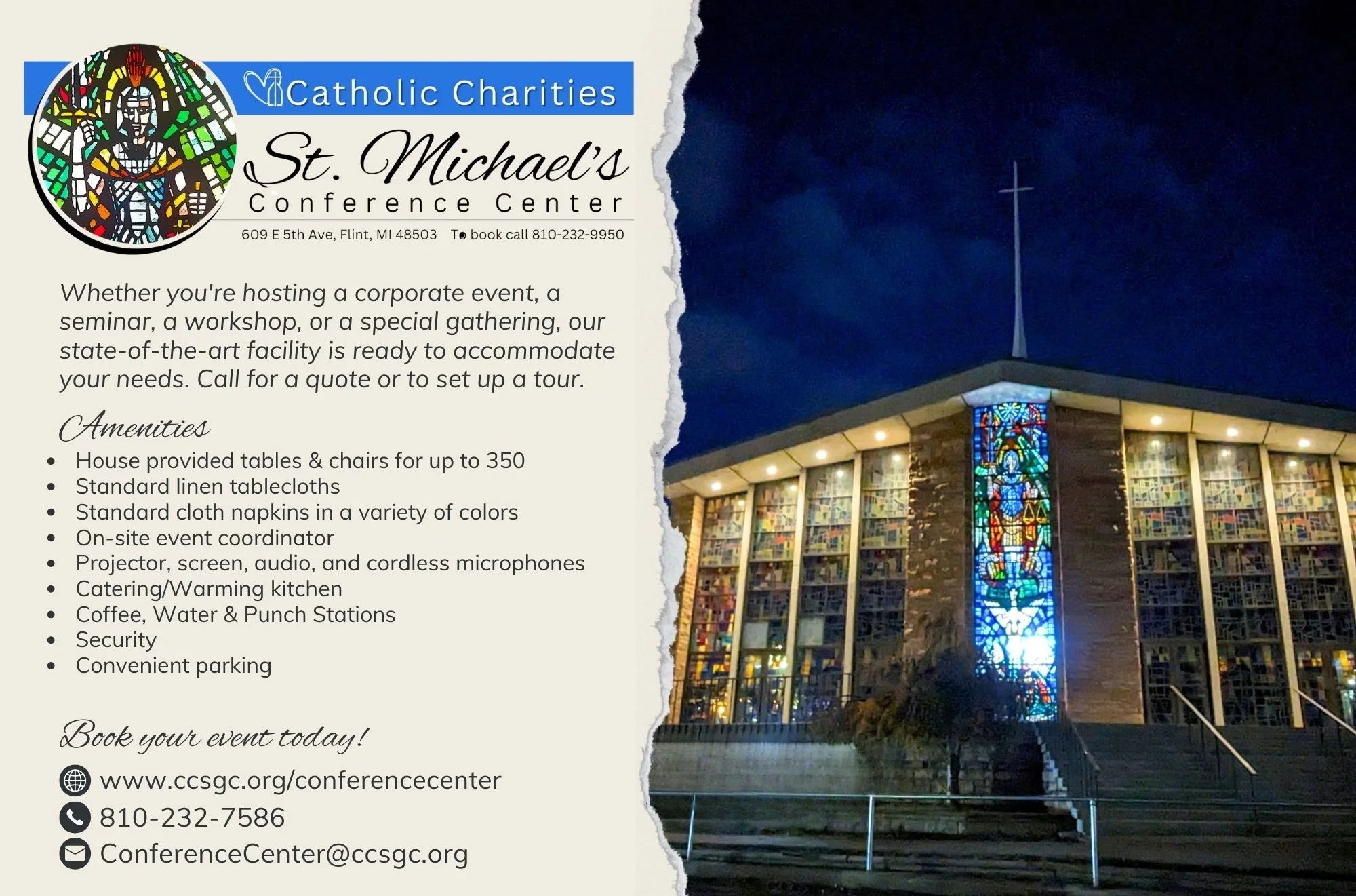 In 2017, St Michael’s was merged with St. John Vianney Parish, and the St. Michaels Catholic school was demolished. In 2019 the decision was made to sell the church, leaving the fate of Flint’s oldest Catholic Church unclear. In February 2021 Catholic Charities of Shiawassee and Genesee Counties announced the purchase of St. Michael Catholic Church. Father Thomas Firestone, Catholic Charities board member and pastor of Catholic Community of Flint is quoted ““We are very pleased that St. Michaels will join the Catholic Charities Campus as the site moves into a new era!”